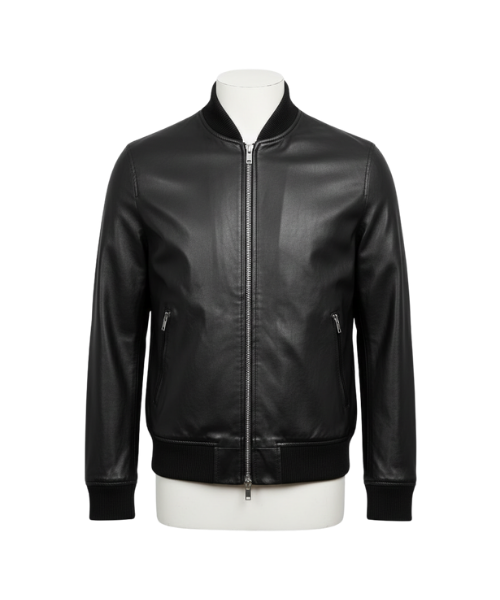 A soft and lightweight bomber leather jacket with ribbed cuffs, collar, and bottom. The smooth leather texture gives a modern and clean look. Great for casual winter wear and everyday styling.
